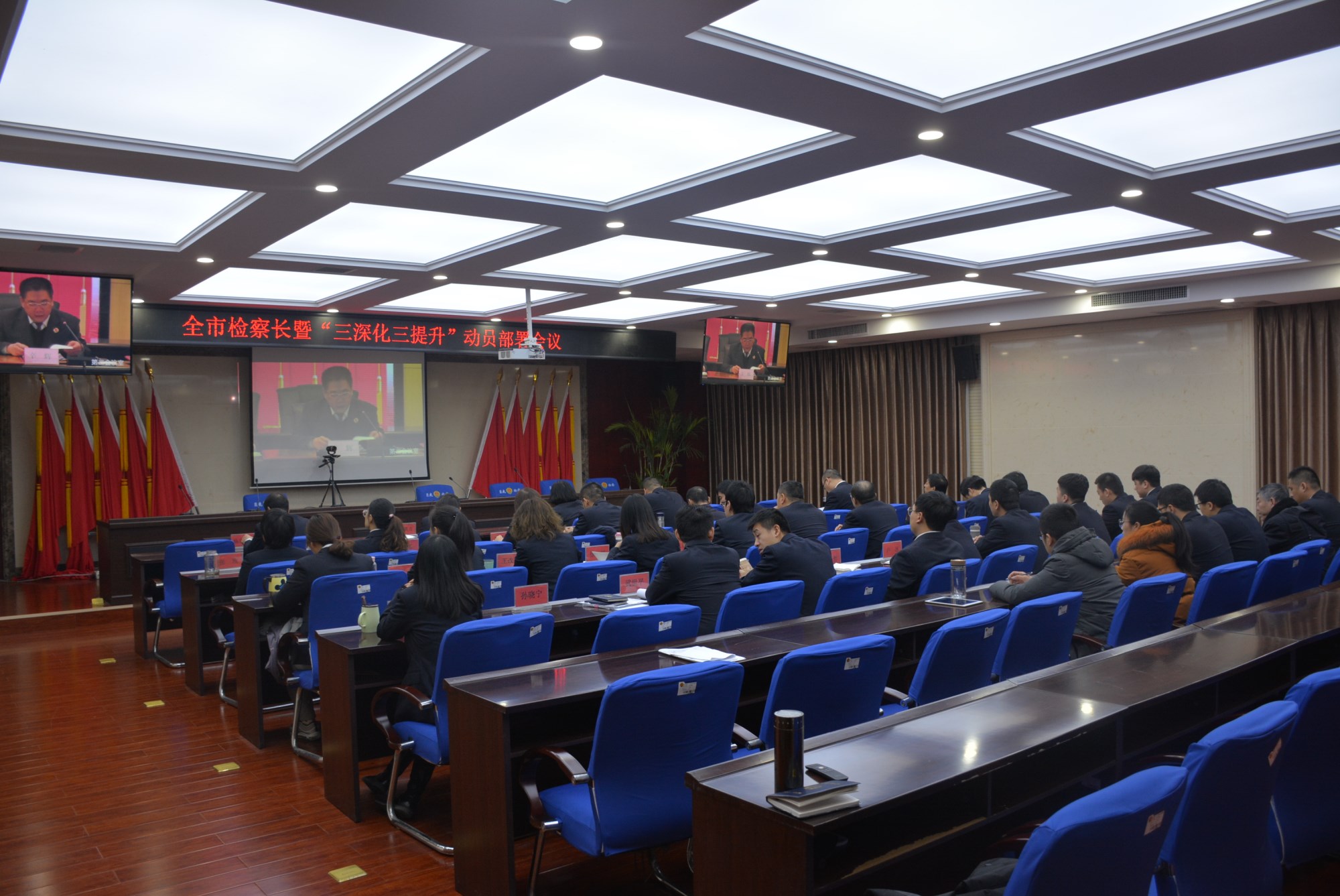 2018年2月20日上午,我院组织全体干警收听收看全市检察长会议暨“三深化三提升”动员部署会。会后,按照“树品牌意识、创一流工作”和“日常工作项目化、项目工作品牌化、品牌工作亮点花”的要求,分管领导组织科室进行学习,并初步拟定2019年工作措施和目标。各科室迅速落实,对我院2019年检察工作任务进行了目标责任分解,并发表自己收听收看会议的心得体会。